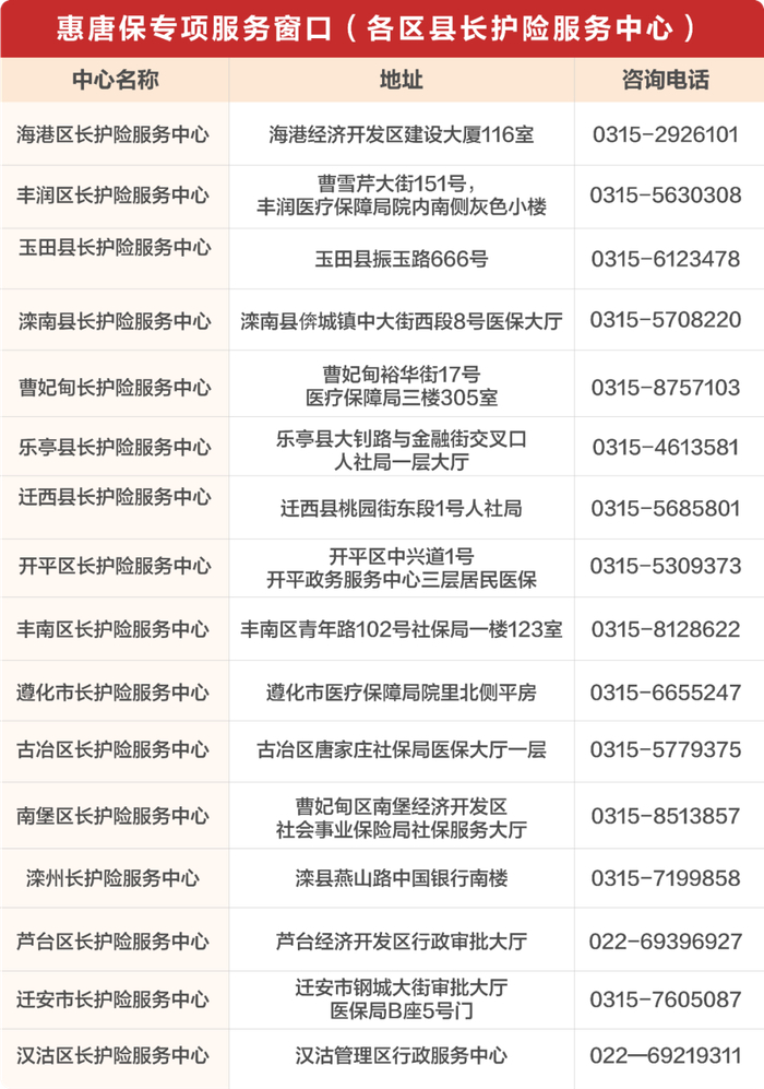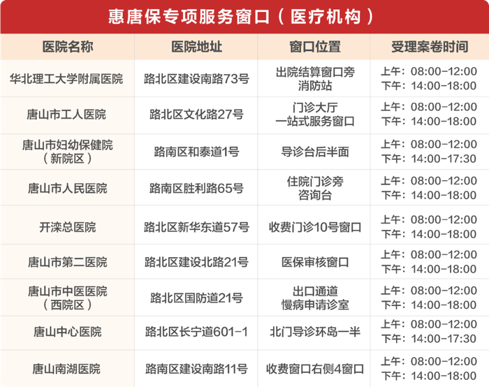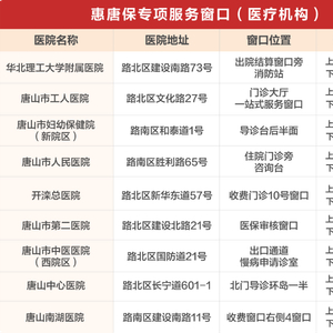 为进一步方便参保人员享受“惠唐保”待遇,经研究决定在各县(市、区)、开发区(管理区)医保经办机构和市本级部分定点医疗机构设立“惠唐保”专项服务窗口。