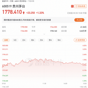 5月30日,贵州茅台报收1778.41元,上涨1.32%。