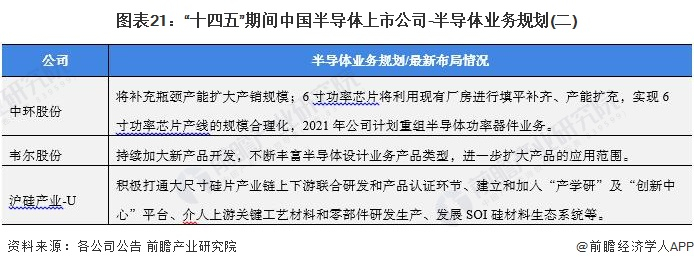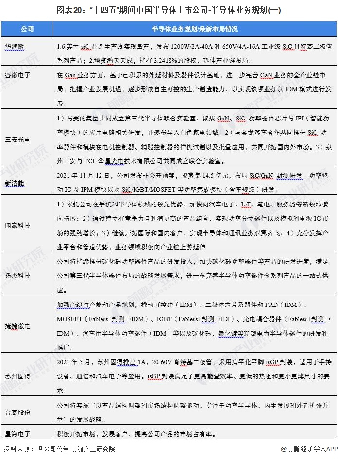“十四五”规划对于半导体产业做出重要指引,并强调了第三代半导体的发展。据此,产业内上市企业纷纷认识到高端产品研发、实现国产替代的重要性,积极布局高端芯片及第三代半导体材料领域。前瞻汇总行业上市企业相关业务规划如下: