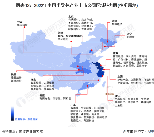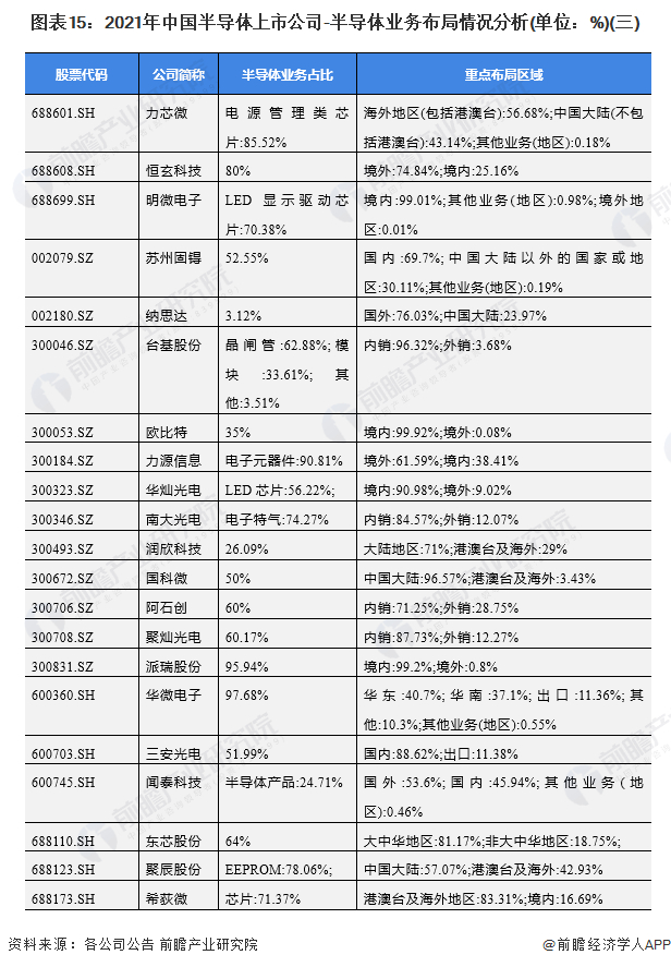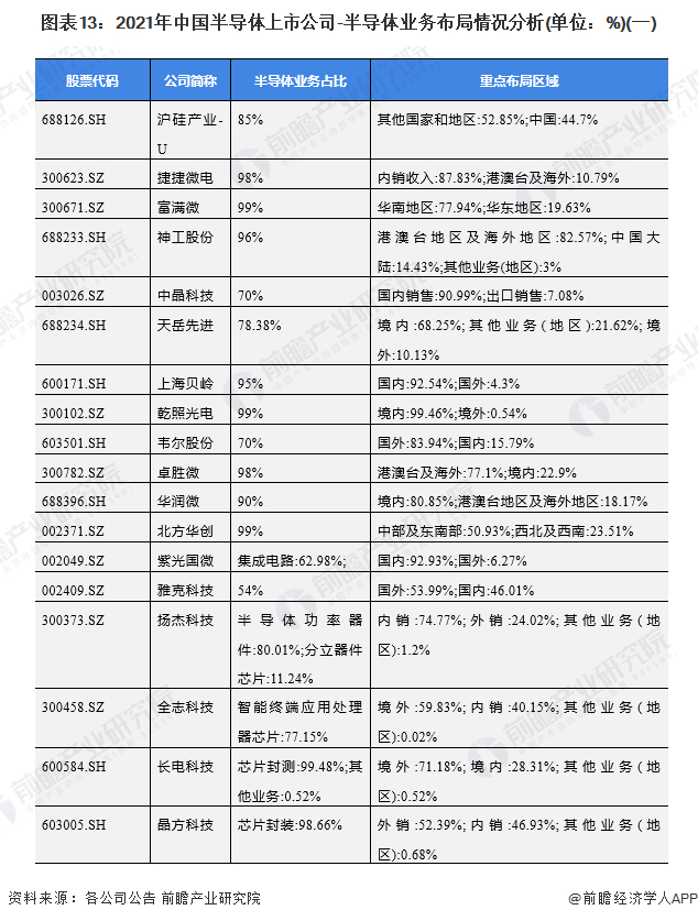 中国半导体行业的上市公司业务布局广,多以内销为主、外销为辅,内销地区主要集中于长三角、珠三角等半导体生产配套条件完善、市场需求大的地区。