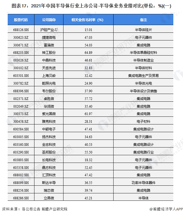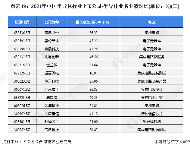 汇总中国半导体行业上市公司2021年相关业务业绩情况,由于身处产业链环节不同、企业自身业务,模式差异,企业盈利能力差别较大,其中从事集成电路生产销售的臻镭科技相关业务毛利高达80%以上,而从事半导体原材料生产销售的有研新材业务毛利率仅为3.78%。