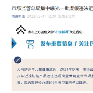 中国网财经5月31日讯 (记者 钟文鑫)据国家市场监督管理总局微信公众号“市说新语”消息,2021年以来,市场监管部门组织开展了儿童青少年近视防控产品违法违规商业营销宣传专项整治行动,严厉打击相关虚假违法广告。现选取已经办结的6件典型案例予以曝光。