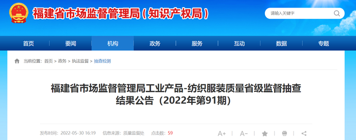 中国质量新闻网讯 2022年5月30日,福建省市场监督管理局网站发布《福建省市场监督管理局工业产品-纺织服装质量省级监督抽查结果公告(2022年第91期)》。