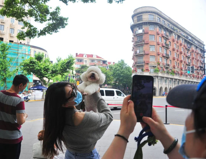 2022年5月30日,上海,当天,尽管天气有些炎热,但沪上著名的打卡景点---武康大楼周边也迎来不少专程前来打卡的市民。其中一些是从宝山、杨浦赶来的,有的还带了自己的宠物犬拍照留影。随着申城疫情防控转入常态化,街头的人气也在逐步复苏,市民惬意地坐在街边赏景聊天,拥抱久违的烟火气,回归往日如常的城市生活。图/IC