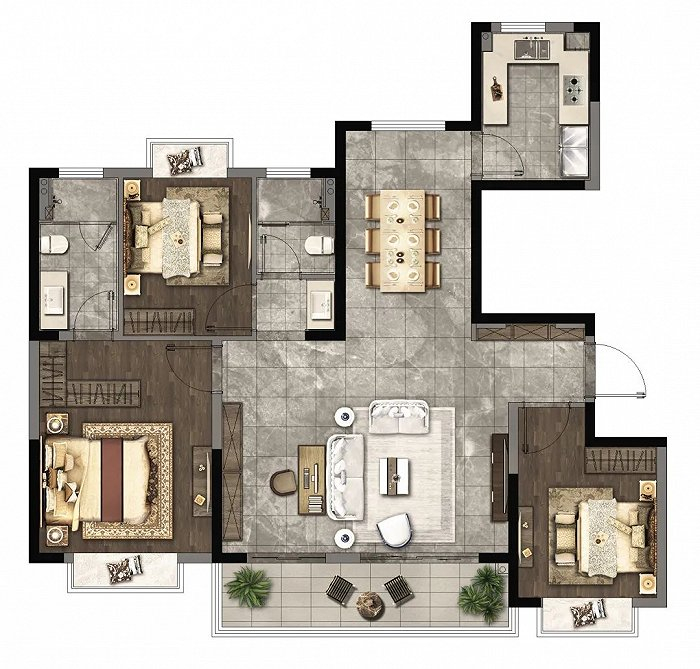 户型均为4室2厅3卫布局,尺度阔绰,居住舒适。