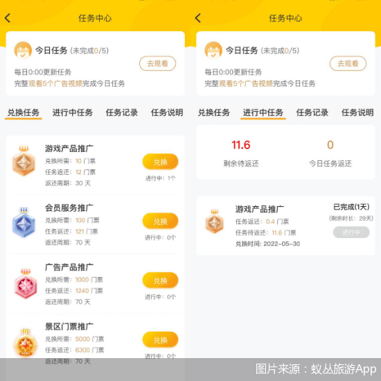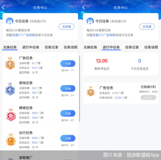 另一方面,除了门票挂钩虚拟货币外,蚁丛旅游还在2022年3月推出了“旅游联盟链”App,主打区块链+旅游新生态。但平台内整体设置与蚁丛旅游如出一辙,相较蚁丛旅游,旅游联盟链App返还周期更短、收益更高。例如需要1000张门票的商城任务,返还周期为30天,用户可获得1250张门票。