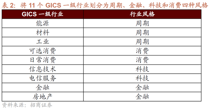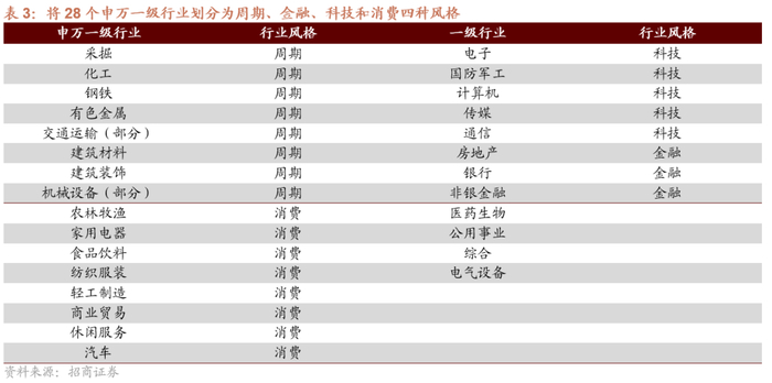 而另一种则是以上市公司本身的经营特性和行业特征,称之为行业风格或者叫大类行业风格,例如周期、金融、科技、消费等。我们可以将11个GIGS一级行业分类或者28个申万一级行业划分成周期、金融、科技和消费四种风格,这种风格的划分属于行业风格。是相关度较高的行业共同属性,这个属性受到相似的变量影响。