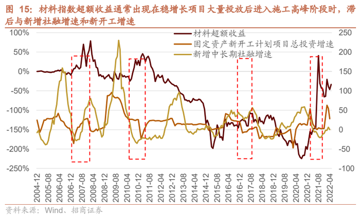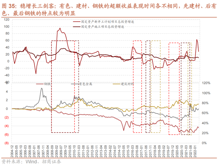 2020~2021年稳增长也出现了相似的特征,2019年稳增长就有发力的迹象,固定资产新开工增速开始持续反弹,建材就开始有超额收益,等到2020年三季度,稳增长进入施工高峰后,建材超额收益反而回落,而有色超额收益开始明显提升。