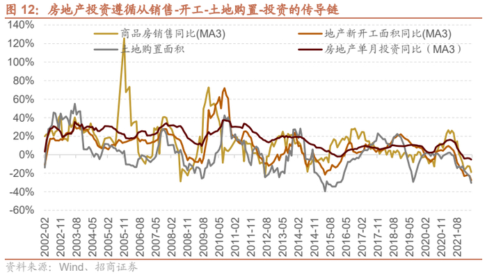 对于房地产投资来说,遵循从销售-开工-土地购置-投资的传导链