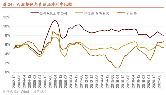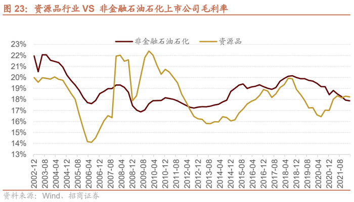 从毛利率角度,资源品自2002年开始,大部分时间毛利率低于非金融口径上市公司,2016年后供给侧改革和2020年疫情后全球流动性宽松的背景下出现了两轮明显提升,目前资源品毛利率反超A股整体水平。