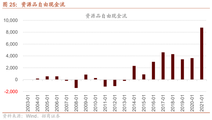 2014年以前,大部分时候资源品自由现金流为负,2014年开始,随着资源品行业上市公司资本开支不断下降,2016年以后盈利能力不断提升,资源品行业自由现金流自2016年之后开始趋于稳定,并于2021年大幅提升。