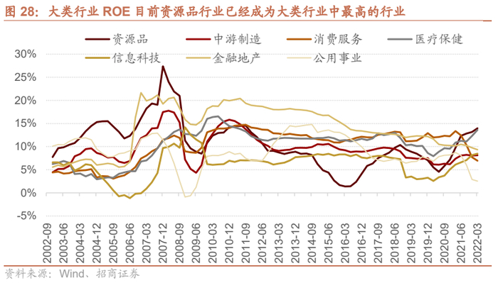 2021年一季度后,各行业ROE持续下行,医药和资源品还保持上行趋势,目前是ROE最高的两个行业