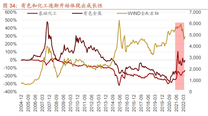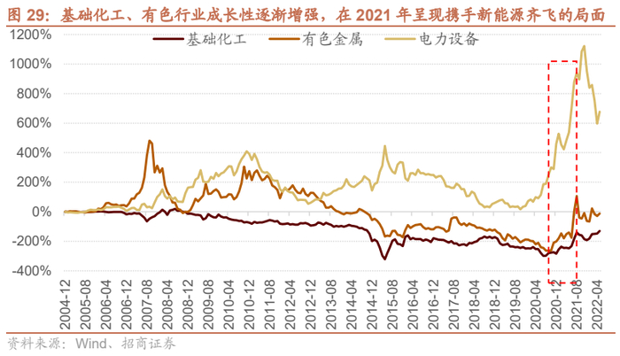 而与信息技术并行的三个成长性方向,分别是医疗医药技术、新材料技术、新能源技术,而后三者基本都与化工材料技术的进步高度相关,因此,周期品中的化工、有色、钢铁等领域开始逐渐涌现出一批在医药工业、新材料工业、新能源工业的成长性标的,这些标的的市值增加,逐渐改变了有色化工的属性,有色和化工的周期性逐渐降低,而成长性开始加强。2021年,有色化工携手新能源大涨,也开启了“成长性周期股”投资的新局面。