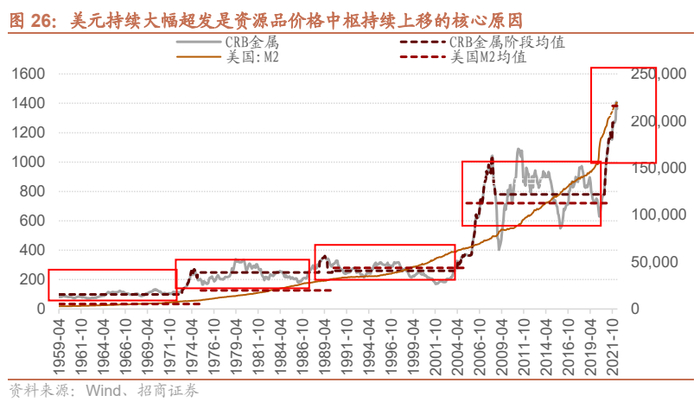 而二战结束以来,以美元定价的大宗商品基本上每15年会上一个台阶,因为美国可以利用美元超发向全球征收铸币税,因此美元是持续超发的,每隔十五年,随着供应冲击到来,大宗商品就会重新定价,上一个大台阶,历史上以CRB金属为代表,分别在1973年中东战争后大宗商品上一个台阶, 1980年代至90年代的初的中东多次战争后,上一个小台阶,2005年全球经济大发展后再上一个大台阶,而15年后的2020年,疫情爆发后全球货币大扩张后,全球大宗商品价格有望再上一个大台阶。