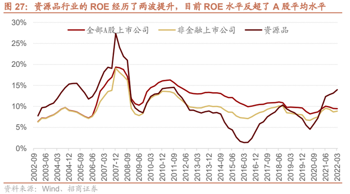 2016年和2020年之后,资源品行业的ROE经历了两波提升,目前ROE水平反超了A股平均水平。