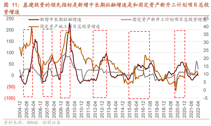 新增中长期社融增速和固定资产新开工计划项目总投资额增速是施工增速的领先指标。