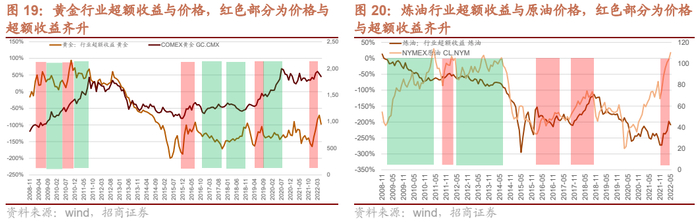 2009~2011年的增长,有色建材几乎是较为同时出现超额收益,但是到了2016年开始,有色建材开始出现较为明显的差异,当稳增长目标开始提出,新项目开始提速,融资开始提速,建材就开始出现超额收益,出现了早周期的特征;而有色则等到施工高峰来临时超额收益更加明显;而钢铁则是到了稳增长后期,可能政策已经开始退出,但是钢铁价格还在刚性,钢铁行业开始以相对抗跌的方式出现超额收益。