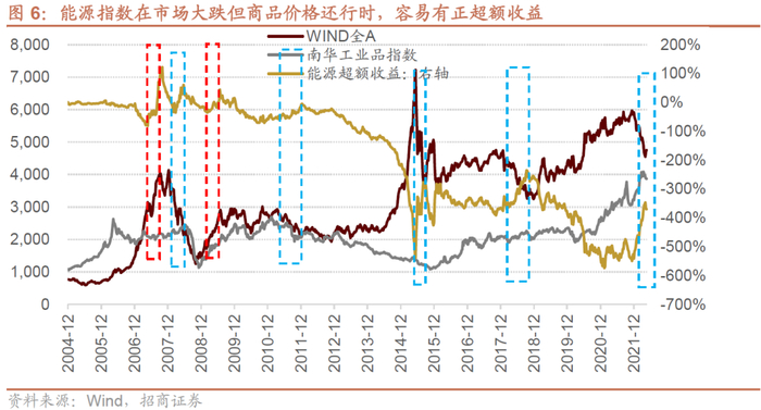而能源指数在市场好,大宗涨的时候,超额收益往往不理想,反而是市场大跌但商品价格还行时,有很强的超额收益,但是这种超额收益,往往是以抗跌的形势存在。2011年,2018年,2022年,在“类滞涨”的阶段,能源的超额收益非常明显。