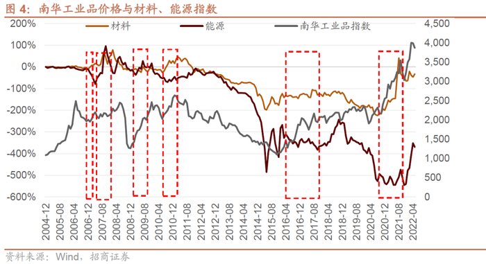 如果以南华工业品指数作为另外一种更加明确的“周期风格”,从历史上看,南华工业品大涨的阶段,材料行业或多或少能够有所表现,而能源则大部分时候表现一般,因此,材料行业指数是更加“周期风格”的代表指数,而能源股本质上没啥周期性。