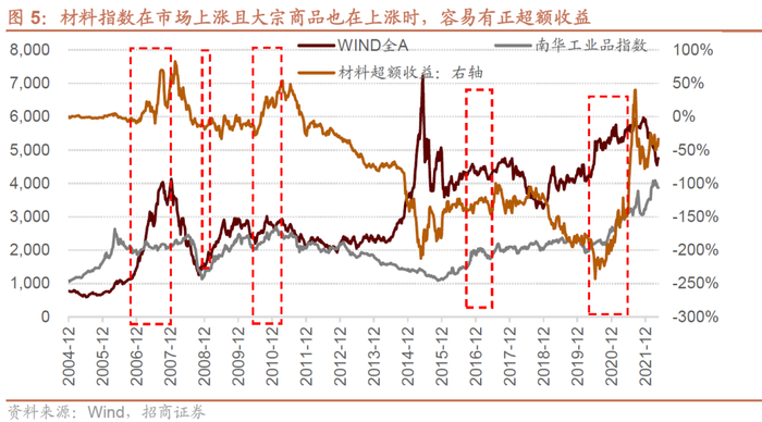 ⚑ 第二,材料与南华工业品是正相关的,在市场上涨且南华工业品上涨时,材料指数能有超额收益,体现为“顺周期”的特征;