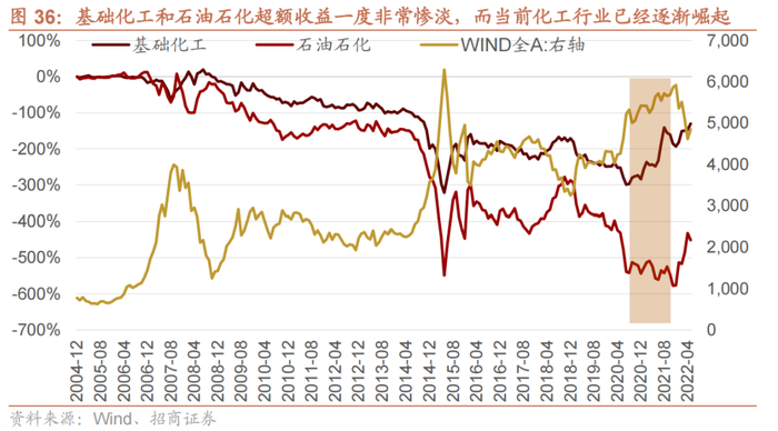 早些时候,基础化工和石油石化的相关性非常高,基本是同涨同跌,且超额收益较为惨淡,基础化工在石油石化产品基础上进行加工,尽管石油石化是基础化工的成本,一般是石油石化价格涨,基础化工跟涨,基础化工盈利才能改善,而石油石化价格跌,表明需求不好,而基础化工尽管成本下行但是价格可能跌更多,在那个产能过剩的年代,基础化工和石油石化成为“难兄难弟”