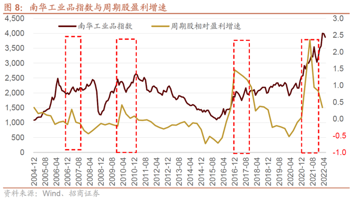 周期风格尤其是材料指数能够有相对的超额收益,周期股就需要有较强的盈利增速,而周期股的盈利优势一般是从底部上行一段之后,均价已经明显抬升之后,而且,一旦大宗商品价格上涨超过盈亏平衡线,向上的盈利弹性会非常大。因此,周期风格中材料指数的超额收益,最明显的是周期品价格“高位加速”,例如2007年,2010年三季度,2017年三季度和2020年四季度到2021年三季度。