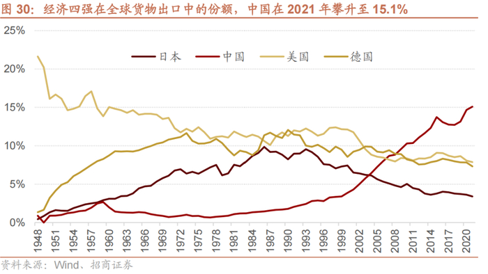 有色化工钢铁等周期行业的另外一个成长性来自于中国制造在全球制造份额的提升,2001年中国加入WTO以来,通过承接全球加工制造产能,实现了在全球份额的快速提升,中国在全球制造业出口份额在2021年提升至15.1%。很多市场人士担心中国制造在全球份额下降,就目前而言,确实有一部中低端加工产能在向着东南亚、南亚等地转移,但是只要对中国制造业却在不断进行升级,向着中高端制造迈进,因此,在全球中高端份额中,中国企业的份额在不断提升。具体可参考2021年策略团队发布的《“补链强链”之国产新材料篇》