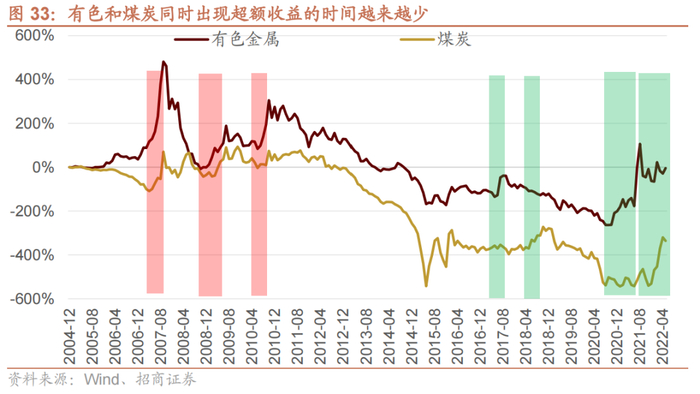与市场认知完全不同的是,所谓的周期股,分为材料和能源后,我们会发现,这两类周期股很多时候超额收益都是反向的,材料指数容易在市场大涨的时候出现超额收益,而能源更容易在市场大跌的时候出现超额收益,除此之外,能源和材料在很多时候都是携手跑输WIND全A。而两者同时出现超额收益的时候非常少,材料的代表有色和能源的代表煤炭,“眉飞色舞”更像是昙花一现。