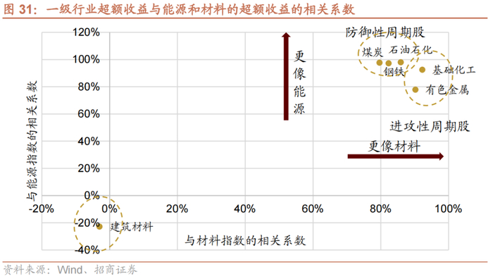⚑ 按照本文的分类,有色、化工、建材、钢铁属于材料,属于进攻性周期股,煤炭、石油石化属于防御性周期股。但是如果进一步计算一级行业超额收益与能源和材料的超额收益的相关系数,钢铁和煤炭石油石化一样,与能源相关度更高,有色和化工更接近材料;