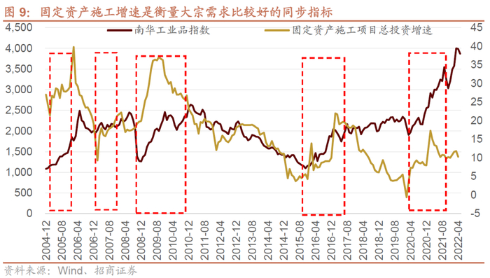 周期股的盈利增速或者大宗商品的价格是典型周期运行,大宗商品价格的波动取决于供求关系,但是大部分时候主要取决于需求,而固定资产施工增速是衡量大宗需求比较好的同步指标。