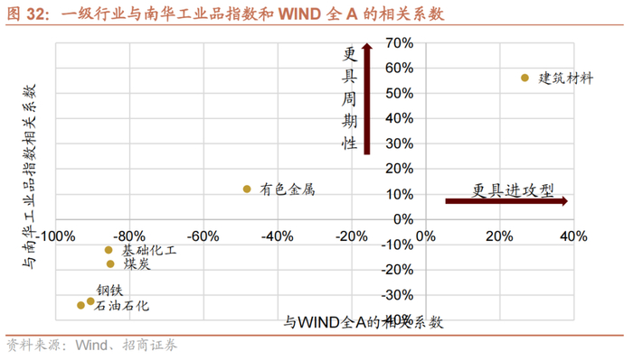 如果计算一级行业与南华工业品指数和WIND全A的相关系数,建筑材料超额收益与南华工业品指数和WIND全A指数正相关较高,是最具进攻性的周期品种,其次是有色,再次是基础化工、煤炭、钢铁和石油石化。