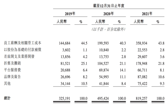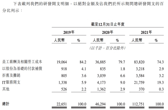 而圆心科技销售及市场推广费却猛增,三年累计投入16.4亿元,2019年至2021年分别为3.25亿元、4.95亿元、8.19亿元,占总收入的比例分别为13.8%、13.7%及13.8%。