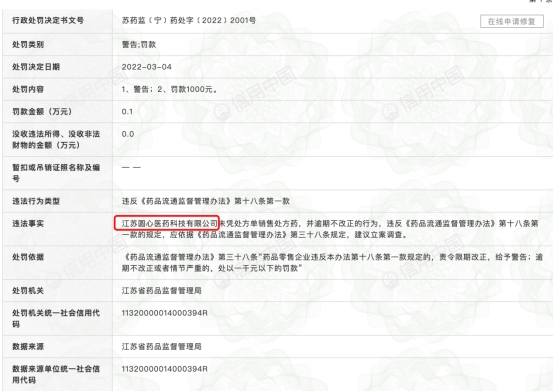 信用中国显示,2022年3月4日,江苏圆心医药科技有限公司因未凭处方单销售处方药,并逾期不改正的行为,违反《药品流通监督管理办法》第十八条第一款的规定。依据《药品流通监督管理办法》第三十八条“药品零售企业违反本办法第十八条第一款规定的,责令限期改正,给予警告;逾期不改正或者情节严重的,处以一千元以下的罚款”,江苏省药品监督管理局对其警告并罚款1000元。