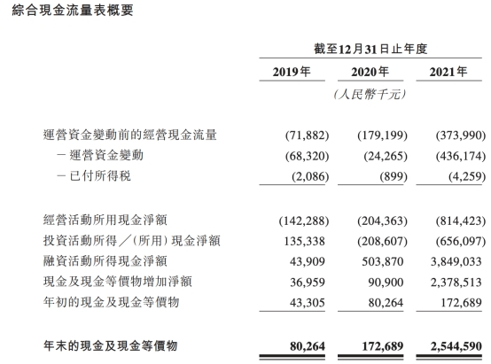 截至2019年、2020年及2021年12月31日止年度,圆心科技分别录得经营现金流出净额为1.42亿元、2.04亿元及8.14亿元。