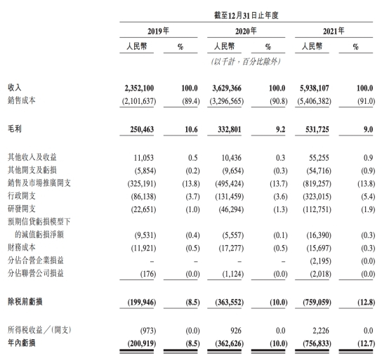 截至2019年、2020年及2021年12月31日止年度,圆心科技的销售成本分别为21.02亿元、32.97亿元、54.06亿元,占总收入的比例分别为89.4%、90.8%及91.0%。