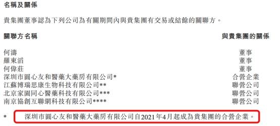 招股书显示,深圳市圆心友和医药大药房有限公司自2021年4月起成为圆心科技的合营企业。