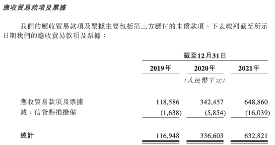 圆心科技的应收贸易款项及票据主要包括第三方应付的未偿款项。2019年末至2021年末,公司应收贸易款项及票据总额分别为1.17亿元、3.37亿元、6.33亿元,2020年同比增长187.9%,2021年同比增长88.0%。