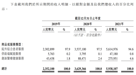 2019年至2021年,圆心科技的院外综合患者服务实现收入分别为23.03亿元、35.37亿元、56.15亿元,分别占总收入的97.9%、97.5%、94.6%。