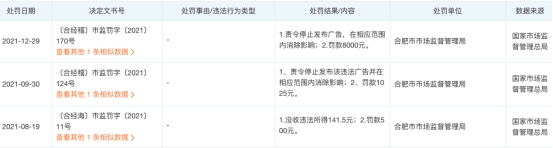 安徽圆心鑫兴大药房连锁有限公司于2021年被合肥市市场监督管理局处罚三次。