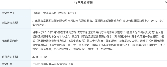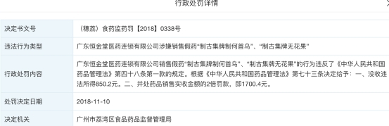 此外,广东圆心恒金堂医药连锁有限公司于2018年至2019年被行政处罚10次。其中,2018年因涉嫌销售假药“制古集牌制何首乌”、“制古集牌无花果”,被广州市荔湾区食品药品监督管理局没收违法所得850.2元并处药品销售实收金额的2倍罚款,即1700.4元。同年,广东圆心恒金堂医药连锁有限公司因未凭处方和通过邮售、互联网方式销售处方药“金戈枸橼酸西地那非片50mg*1片/盒”的行为,被广州市荔湾区食品药品监督管理局警告并罚款769元。