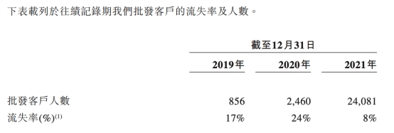 批发客户人数由2019年的856名增加至2020年的2,460名并进一步增加至2021年的24,081名。于2019年、2020年及2021年,批发客户的流失率分别为17%、24%及8%。