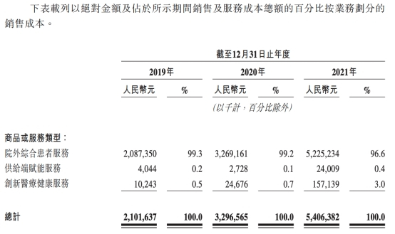 其中,圆心科技院外综合患者服务的销售成本分别为20.87亿元、32.69亿元、52.25亿元。而院外综合患者服务的销售成本的主要组成部份为商品成本。截至2019年、2020年及2021年12月31日止年度,商品成本分别占院外综合患者服务销售成本的99.4%、99.3%及99.4%。