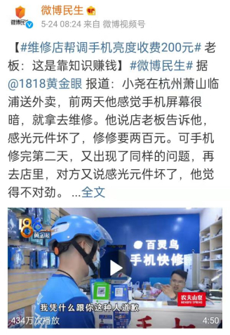 2022年5月24日,有国内媒体关于“维修店帮调手机亮度收费200元”的报道在微博上引发热议,山寨维修店乱象再度成为焦点话题。