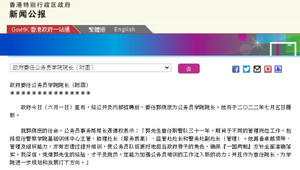 据香港特区政府6月1日新闻公报,4月底从香港警务处副处长任上退休的郭荫庶获委任为香港特区公务员学院首任院长,将于7月5日履新;院长一职属首长级薪级表第六点。