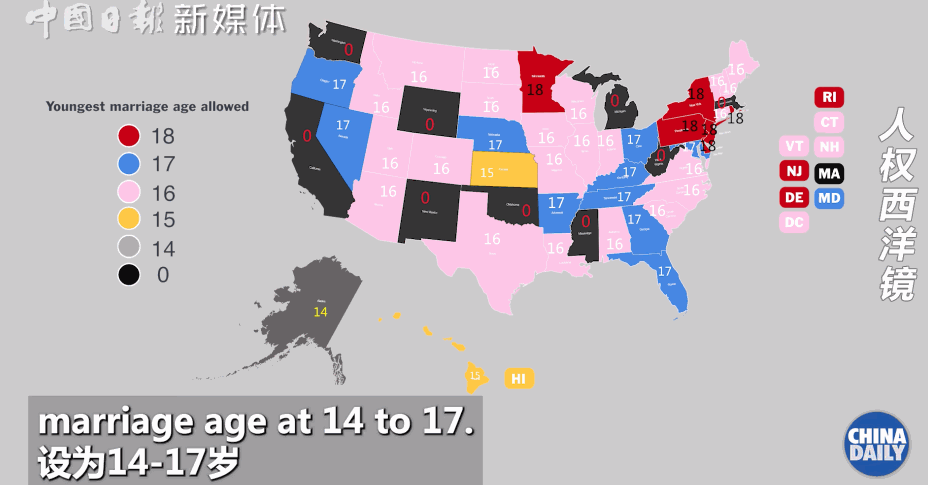 由于“特殊情况”,不少州把最低结婚年龄设为14-17岁,甚至还有九个州连最低结婚年龄都没有。