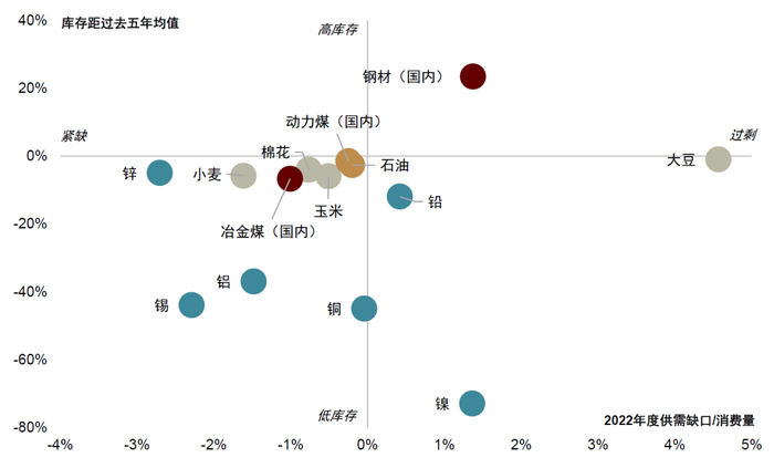 资料来源:万得资讯,彭博资讯,CRU,WoodMac,Mysteel,SMM,USDA,CCTD,中金公司研究部;注:农产品是USDA2022/23期末库存,有色金属是全球库存,钢材是国内螺纹、线材、热卷、冷卷、中厚板贸易商与钢厂库存,冶金煤是国内100家焦化厂、110家钢厂、6港口焦煤库存,石油是OECD原油与成品油库存,动力煤是国内港口库存