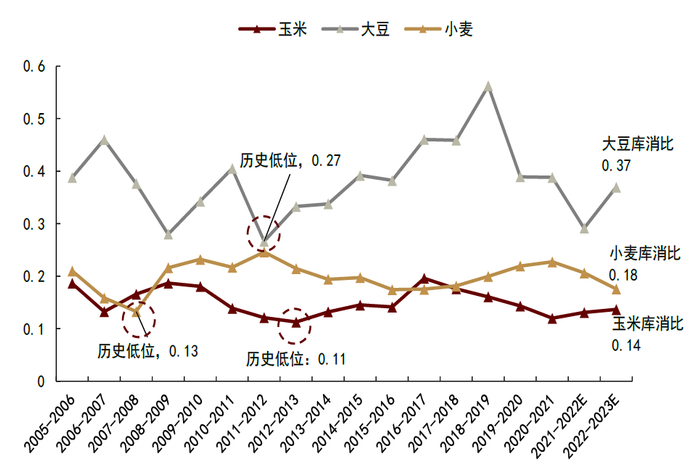库存修复,难言乐观:2021/22年度全球玉米、大豆、小麦、棉花等主要农作物库存均降至五年历史低位,叠加俄乌地缘冲突,全球粮食供给担忧得到进一步强化。随着2022/23年度的开启,我们看到库存恢复情况仍难言乐观,从预测数据看,地缘冲突导致乌克兰冬小麦、春玉米产量受到不可逆减产,尽管美国、加拿大、巴西、印度等主产国贡献边际增量,但全球农产品供给紧平衡趋势未变。我们看到,除大豆产量因美国、南美增产而有所修复以外,其余主要农产品库存大概率将继续去化。2022/23年度全球小麦、玉米、棉花、大豆的库存消费比的同比变化为:-1.46%,-0.05%,0.01%,2.9%。