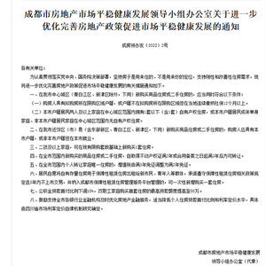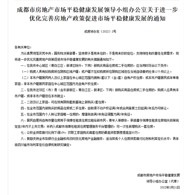 中国网财经6月1日讯 据成都市住房和城乡建设局网站消息,5月31日晚,成都市房地产市场平稳健康发展领导小组办公室发布《关于进一步优化完善房地产政策促进市场平稳健康发展的通知》(以下简称《通知》)。《通知》指出,公积金贷款首付比例下调10%,双职工家庭购买首套住房最高可贷80万;二孩及以上家庭可新购买1套住房;个人转让家庭唯一住房的,增值税调整为满2年免征;居民自愿出租自有存量住房用于保障性租赁住房并承诺遵守相关政策规定,可新购一套住房。