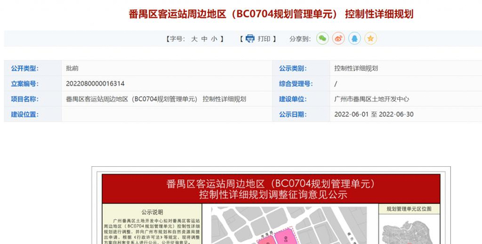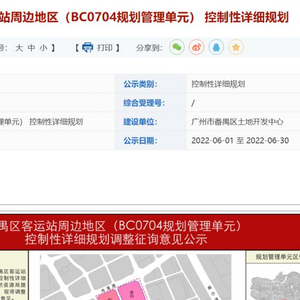 6 月 1 日,广州市规划和自然资源局发布《番禺区客运站周边地区(BC0704 规划管理单元) 控制性详细规划》,规划内容显示,番禺客运站周边将新增一块宅地。