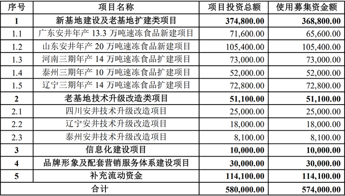 根据定增预案,募资将用于新基地建设及老基地扩建类项目、老基地技术升级改造类项目、安井食品信息化系统项目、品牌形象及配套营销服务体系建设项目和补充流动资金。募投项目建成投产后,安井食品的新老基地将合计新增年产能71.3万吨。此次定增公司实际募资56.75亿元,与计划募资额57.4亿元差距不大。